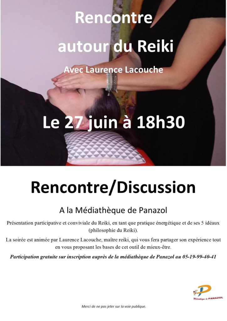 Présentation participative et conviviale du Reiki, en tant que pratique énergétique, et de ses 5 idéaux (philosophie du Reiki). La soirée est animée par laurence lacouche, maître reiki, qui vous fera partager son expérience tout en vous proposant les bases de cet outil de mieux être.