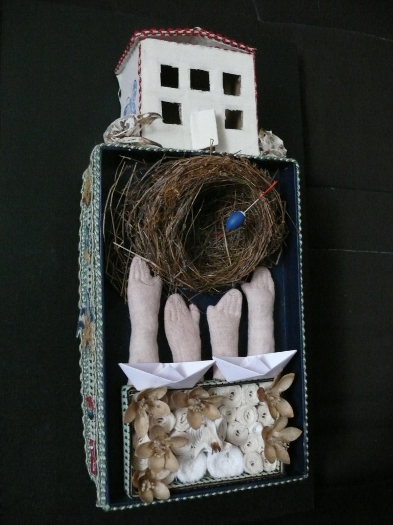 « Le nid déserté et trouvé à la fourche d’une branche, la feuille mise à sécher entre les pages d’un livre ou la graine emportée par le vent nous renvoient à nos espaces intérieurs. A un moment où l’on nous parle chaque jour de la disparition de notre univers, j’ai souhaité mener une réflexion sur les rêves, les pensées, les sentiments, auxquels nous renvoie le plus infime élément de cet univers. De cette réflexion-rêverie est née cette exposition. » (Joëlle Thabaraud)