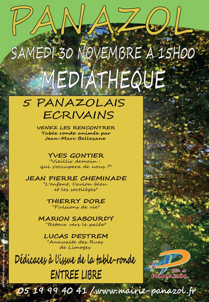 Table ronde / rencontre avec 5 auteurs limousins : Yves Gontier « Vieillir demain: qui s’occupera de nous? », Jean-Pierre Cheminade « L’enfant, l’avion bleu et les sortilèges », Thiérry Doré « Pulsions de vie », Marion Sabourdy « Retour vers le Paléo », Lucas Destrem « Annuaire des rues de Limoges ».