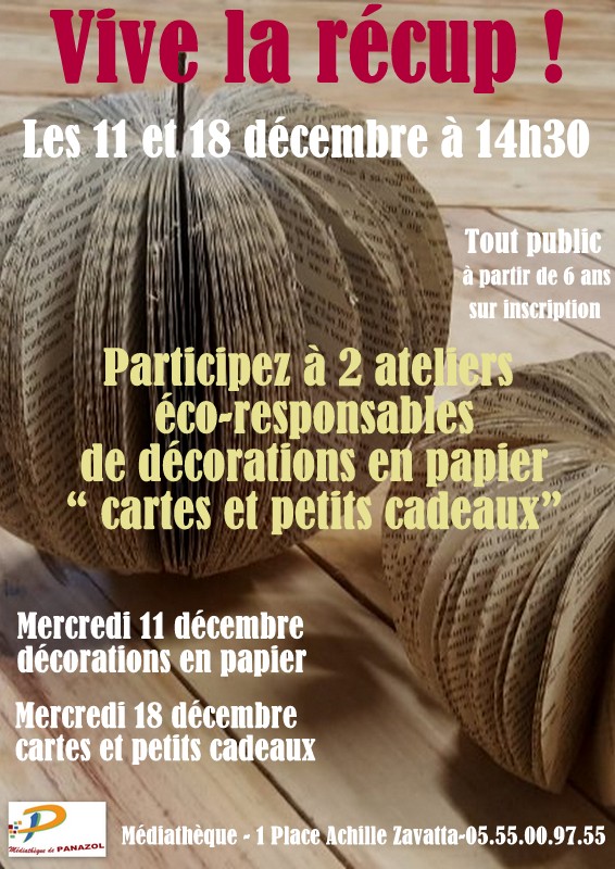 Ateliers: Vive la récup ! Publié le 7 décembre 2019 par médiathèque de panazol Les mercredis 11 et 18 décembre à 14h30 2 ateliers éco-responsables de décorations en papier pour les fêtes (récupération de vieux livres et couvertures, magazines…)Tout public à partir de 6 ans. Gratuit sur inscription. 2 ateliers: les 11 et 18 décembre à 14h30. Partager : Cliquer pour partager sur X(ouvre dans une nouvelle fenêtre) X Cliquez pour partager sur Facebook(ouvre dans une nouvelle fenêtre) Facebook J’aime chargement…