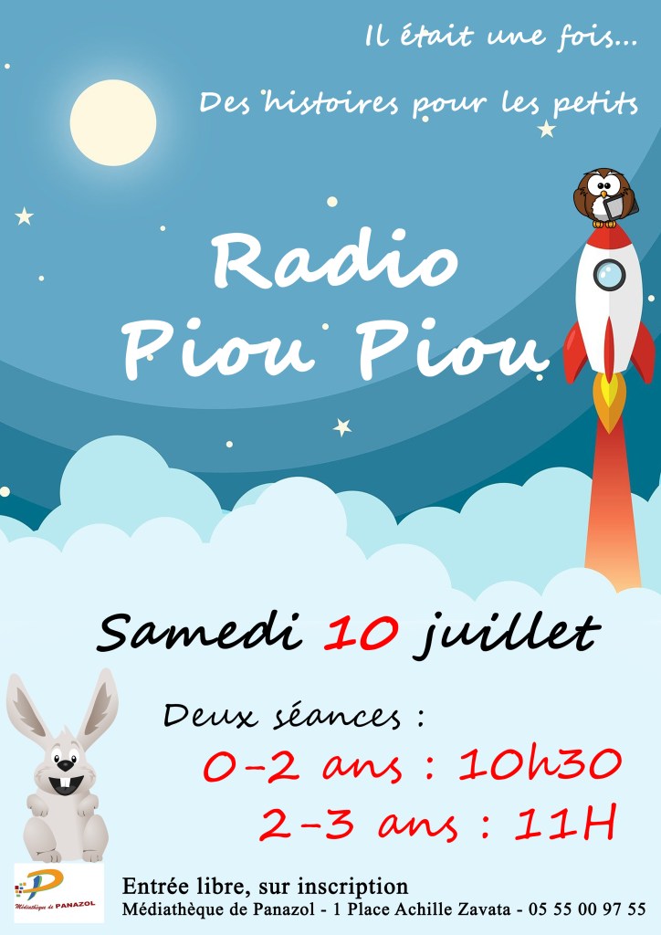 Radio Piou Piou (0-3 ans) Publié le 25 juin 2021 par médiathèque de panazol Samedi 10 juillet 2021 2 séances 10h30: jusqu’à 2 ans 11h00: à partir de 2 ans jusqu’à 3 ans Partager : Cliquer pour partager sur X(ouvre dans une nouvelle fenêtre) X Cliquez pour partager sur Facebook(ouvre dans une nouvelle fenêtre) Facebook J’aime chargement…