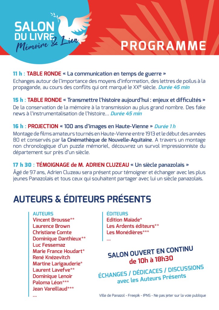 Dans le cadre de la semaine de la mémoire à Panazol, voici le programme de la journée du 13 novembre, avec la présence d’auteurs locaux.