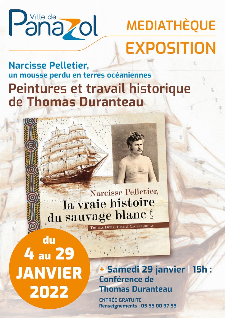Narcisse Pelletier est un jeune mousse de 14 ans qui a été abandonné en Australie au milieu du XIXe siècle suite à l’échouage de son navire. Il est recueilli par un groupe aborigène du Nord Est du territoire, les Wanthaalas, parmi lesquels il a vécu 17 ans. Récupéré de force par un navire anglais, il est ramené en France où il doit se réhabituer à une vie qui n’est plus vraiment la sienne. Cette exposition propose de suivre cet itinéraire extraordinaire à l’origine de la source anthropologique la plus ancienne et la plus complète concernant le Nord Est de l’Australie. Ce parcours est retracé grâce aux peintures de Thomas Duranteau qu’il a réalisées pour son ouvrage sur cette histoire, accompagnées de nombreux documents historiques. Cette exposition soulève la question du regard porté au XIXe siècle sur les autres cultures et le chemin exceptionnel qui a conduit Narcisse à une vraie rencontre malgré son double déracinement.