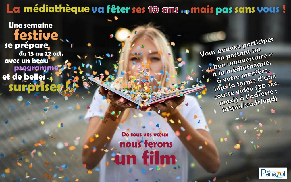 Un film rassemblant les souhaits des lecteurs pour l’anniversaire de la structure va être monté. Si vous voulez vous y joindre il suffit d’envoyer votre vidéo (pas plus de 30 secondes) à l’adresse suivante : https://vu.fr/oqdj