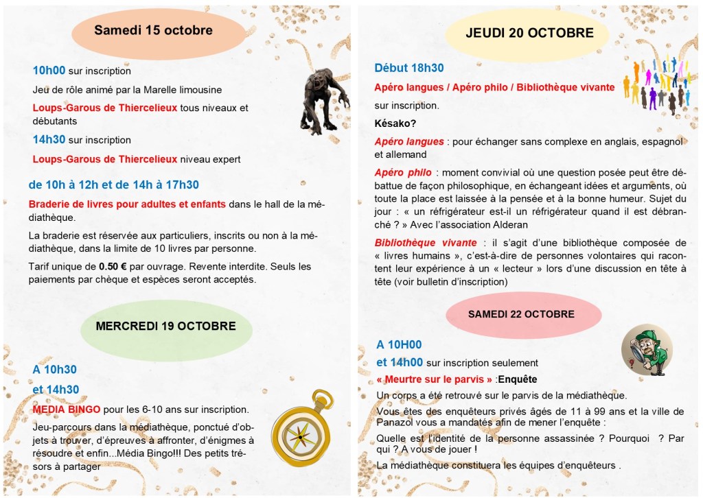 Voici le programme de la semaine anniversaire :) Alors à vos agendas !!! Publié le 3 octobre 2022 par médiathèque de panazol Du samedi 15 au samedi 22 octobre: des jeux, des apéros philo, langues, bibliothèque vivante, une braderie, une enquête et un concert exceptionnel ! Partager : Cliquer pour partager sur X(ouvre dans une nouvelle fenêtre) X Cliquez pour partager sur Facebook(ouvre dans une nouvelle fenêtre) Facebook J’aime chargement…