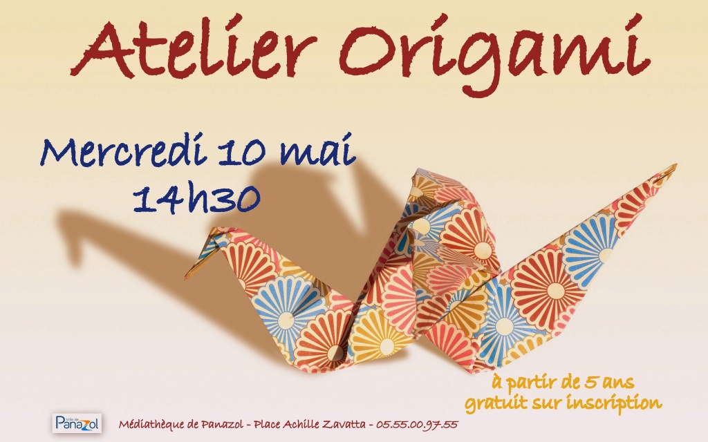Atelier origami Publié le 4 Mai 2023 par médiathèque de panazol Mercredi 10 mai à 14h30 Atelier pour les enfants à partir de 5 ans. Gratuit sur inscription Médiathèque de Panazol Partager : Cliquer pour partager sur X(ouvre dans une nouvelle fenêtre) X Cliquez pour partager sur Facebook(ouvre dans une nouvelle fenêtre) Facebook J’aime chargement…