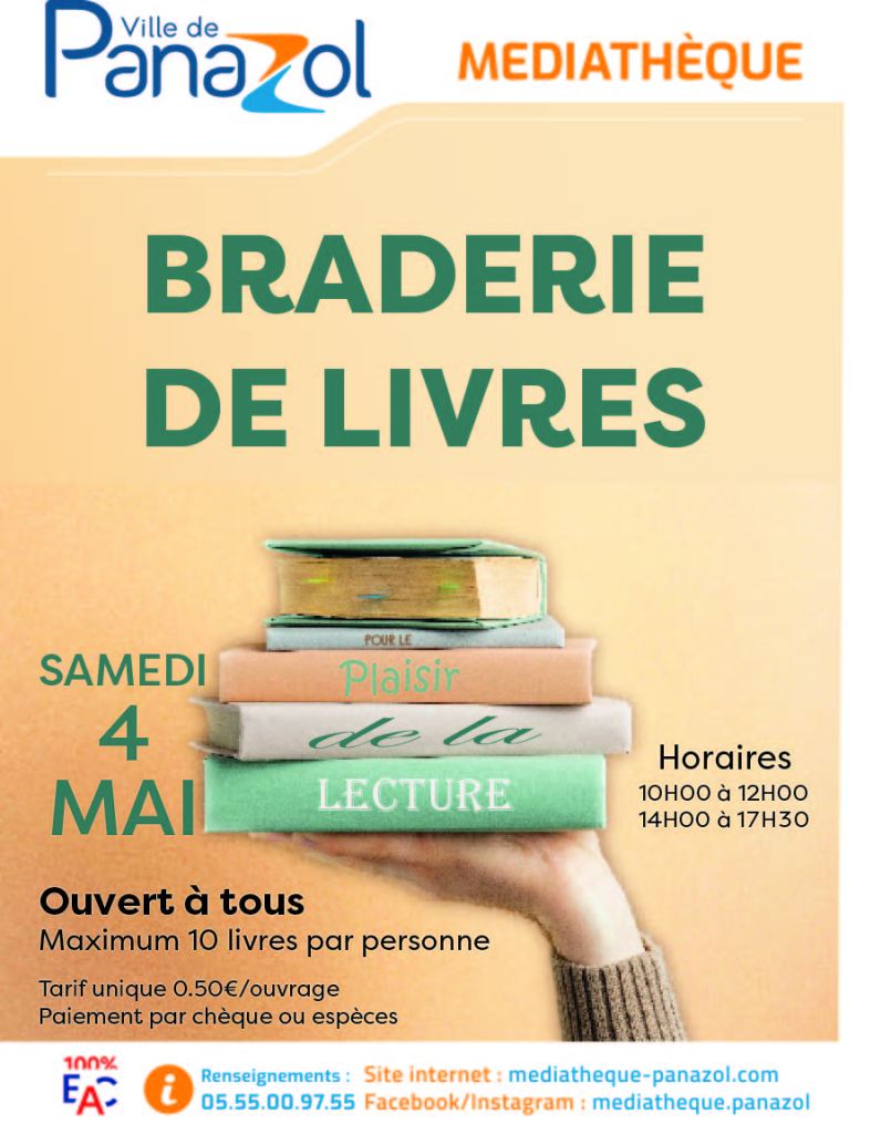 Braderie de Livres Publié le 18 avril 202418 Mai 2024 par médiathèque de panazol Samedi 4 mai de 10h à 12h et de 14h à 17h30 La médiathèque se sépare d’une partie de ses collections, livres adultes et jeunesse. Cette braderie est destinée aux particuliers. 50 centimes l’ouvrage. Maximum de 10 ouvrages par personne. Revente interdite Partager : Cliquer pour partager sur X(ouvre dans une nouvelle fenêtre) X Cliquez pour partager sur Facebook(ouvre dans une nouvelle fenêtre) Facebook J’aime chargement…