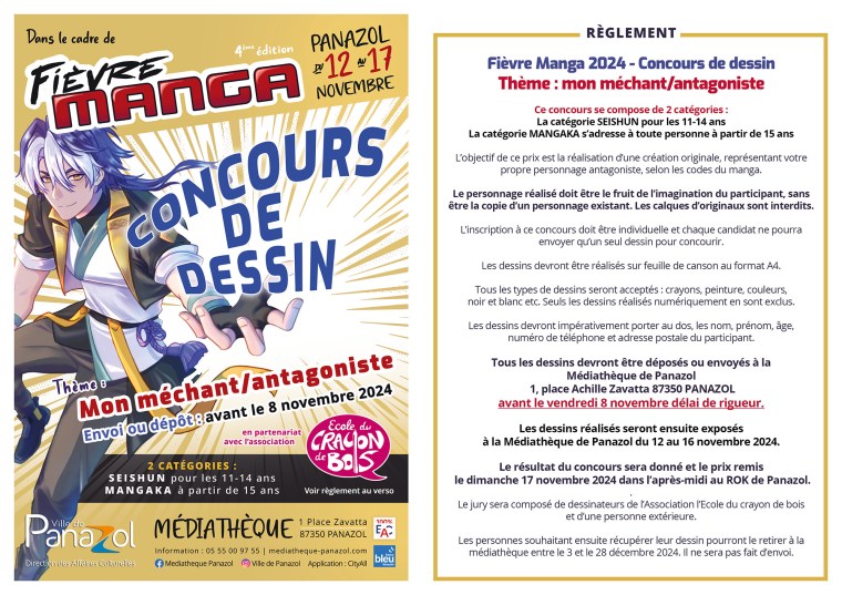 Fièvre Manga – Concours de dessin: un peu plus de temps pour rendre votre dessin! Publié le 6 novembre 2024 par médiathèque de panazol Attention prolongation des dates pour la remise des dessins: Dealine le mardi 12 novembre à midi voir règlement ci-dessous Partager : Cliquer pour partager sur X(ouvre dans une nouvelle fenêtre) X Cliquez pour partager sur Facebook(ouvre dans une nouvelle fenêtre) Facebook J’aime chargement…