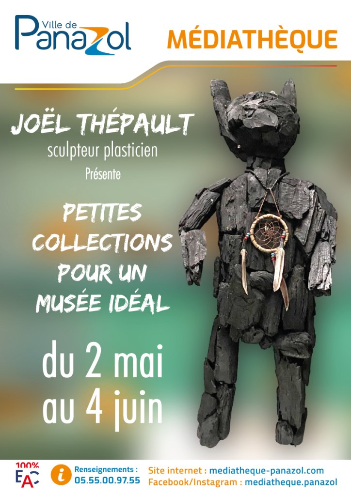 « J’ai mis le titre au pluriel, mon travail consistant depuis toujours à collecter des objets naturels ou bien des objets usés ou abandonnés par la société de consommation qui nourrissent mes pensées et ma façon de travailler ensuite. J’ai toujours eu besoin de faire une mise en scène suivant les endroits où je présentais mon travail. A Panazol je vais présenter une sorte de musée éphémère, des débuts de collections d’objets dans des vitrines des sculptures, quelques pierres gravées, et au mur je pense présenter une série de photographies d’œuvres éphémères que j’ai créées dans la nature depuis plus d’une vingtaine d’années comme dans le parc de la Beausserie en 2009. (Aujourd’hui la plupart de ces créations ont disparues). Artiste de la lisière je me situe entre le sauvage et le civilisé. Dans le titre il y a une allusion au facteur Cheval avec son palais idéal et à l’art singulier. »